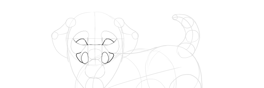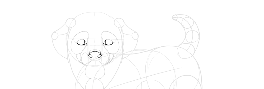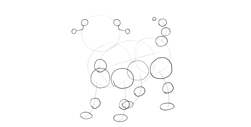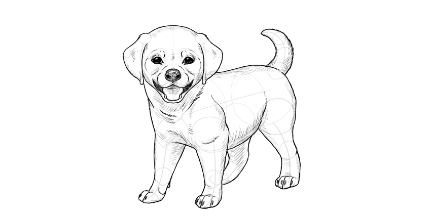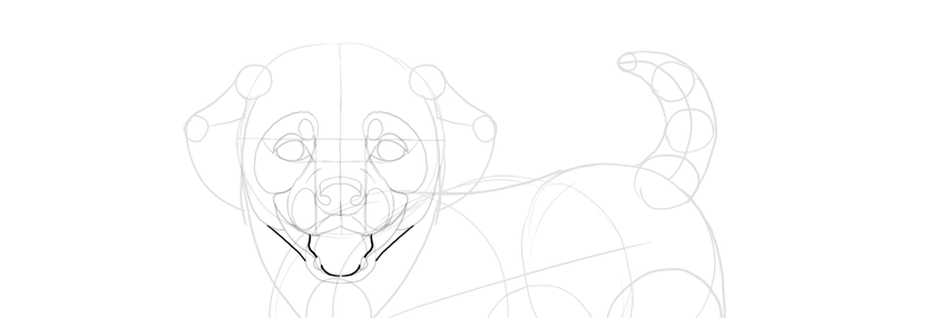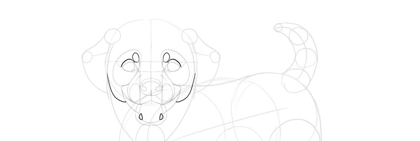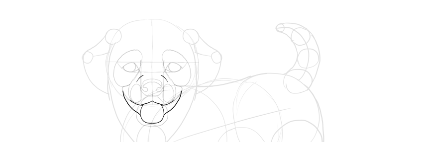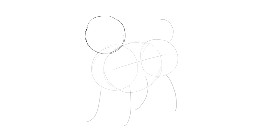 轻轻地勾勒出小狗的身体,画出一系列线条,以在部分(例如躯干和腿部)之间创建自然连接。给爪子一个三角形的尖端,让它们更像狗一样。