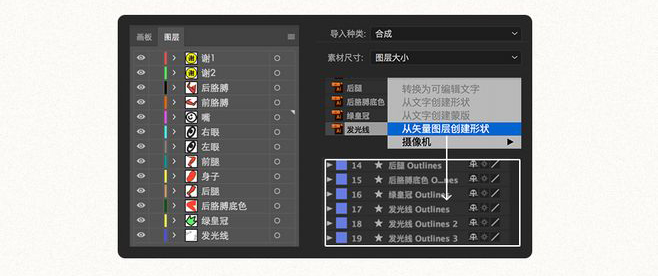 如果亲们是使用AI绘制基础形状,在导入AE前,需要再AI中分别创建图层组。导入时选中导入为合成,素材尺寸为图层大小。在做动画之前把他们右键选择从矢量图层创建形状。嗯~准备工作就做好了~