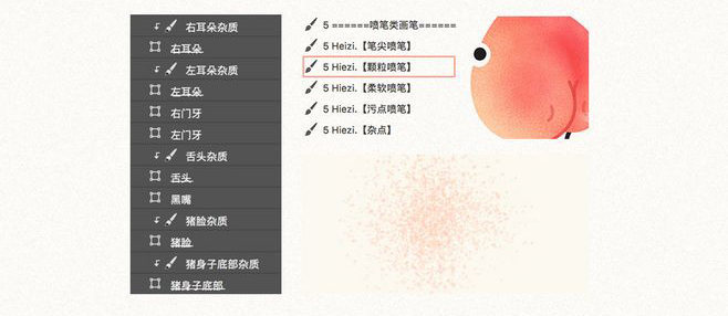 PS简单的绘制形状后,我是用黑子ps画笔库中的颗粒画笔,进行上色的。在文本底部有附件哈~当然,最重要的是要给每层起个动听的名字,对!以方便等会儿扔到AE里做动画。