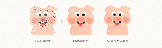 1、这样有毛边含有杂点质感的动画表情是怎样制作出来的呢?一眼就可以看出怎么做的大大们就可以绕开路~~这里拿哈皮家族中的小猪来简单讲一下。首先是绘制表情,一般绘制形状是在AI或者PS里面(直接在AE绘制的也有),因为这次我要添加颗粒效果,所以直接在PS绘制了。