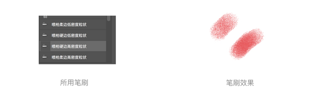 所用笔刷大部分都是喷枪硬边高密度状,一些细节的地方会更换成其他笔刷或者调整笔刷的参数,以下是图上四种笔刷的效果,可根据自己想要的效果选择。
