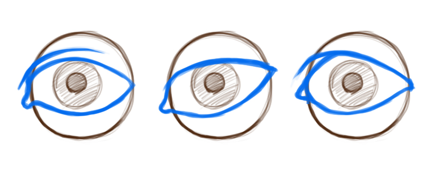 注意上下眼睑。眼睛和眼皮的形状会因人而异。请注意,看如图下蓝色线,不是直线。它们仍然保持头脑中的眼睛表面的圆形性质。