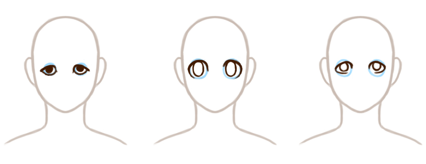 好吧,我喜欢想像眼球和眼睑之间的关系,就像一块布在物体上一样—眼睑包裹在眼睛周围。它们是圆形的,围绕眼球的形状。如下图例