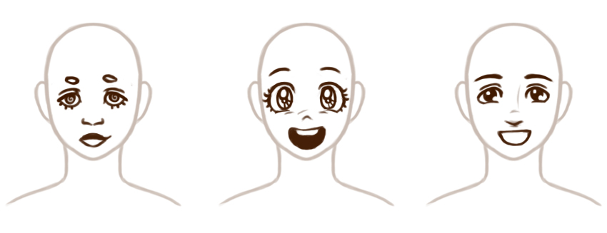 首先,从降低面部的基本比例开始。请记住,眼睛距离往往相同。现在是考虑要夸大哪些方面的好时机。你会睁大眼睛吗?小眼睛?
