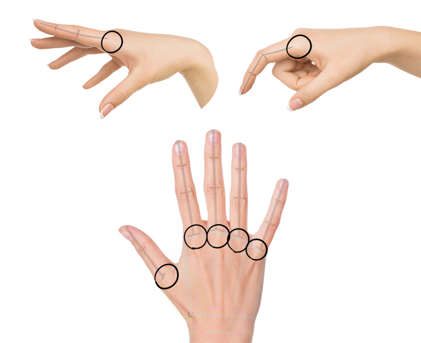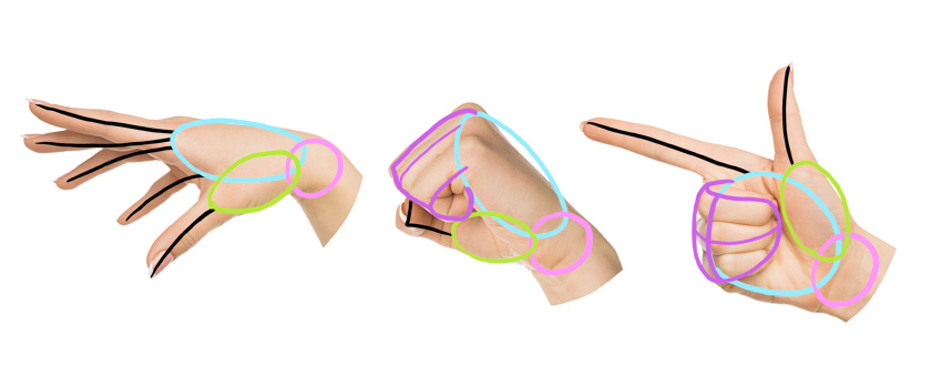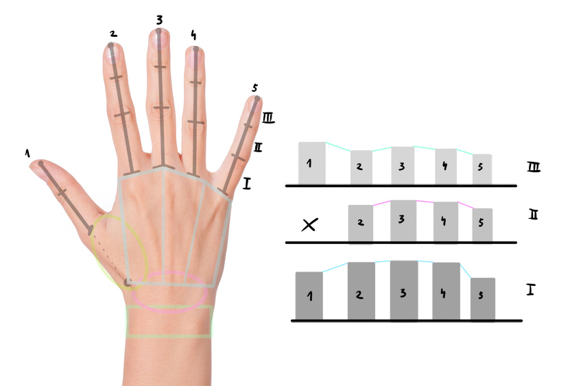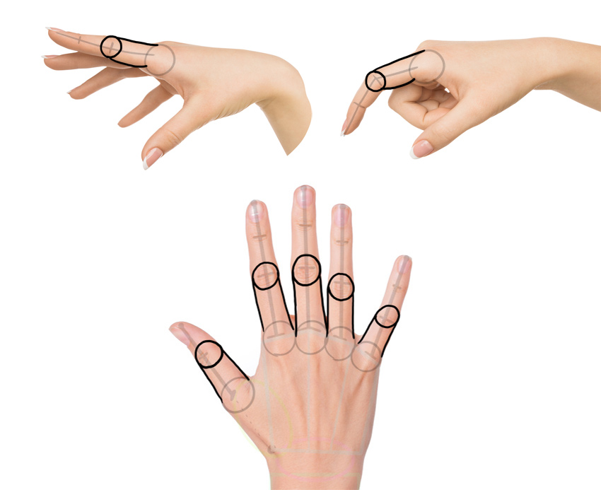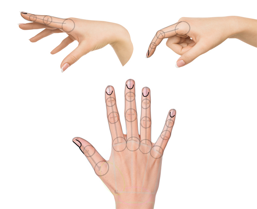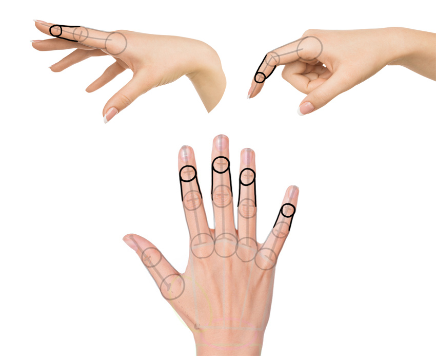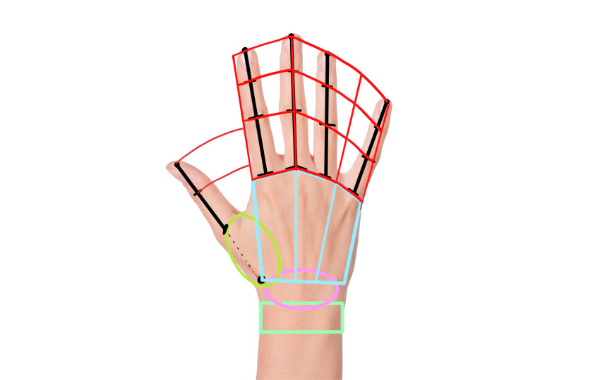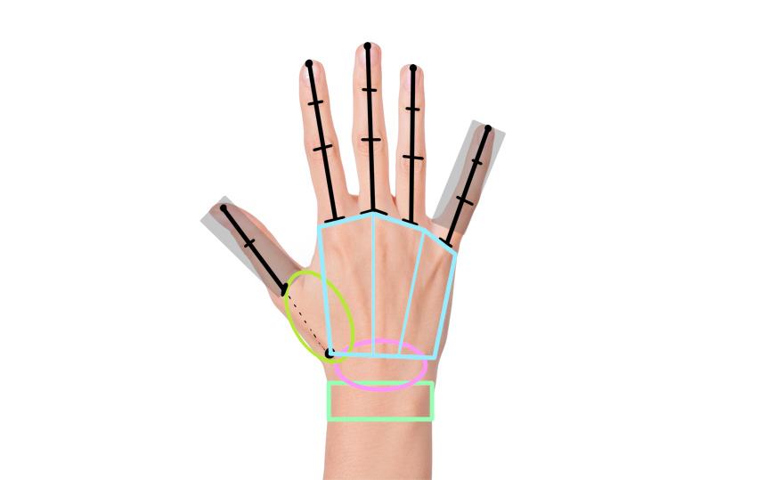 如您所见,手指的长度大于它们的外观。它们被“埋在”手掌中,这使该部分的柔韧性降低。因此,出于实际原因,最好将手指视为手掌末端的起点。