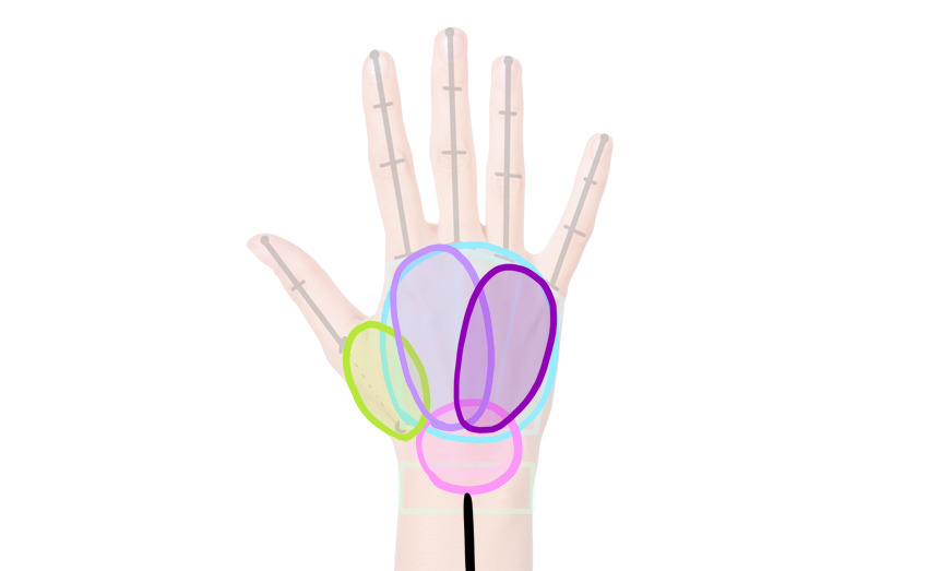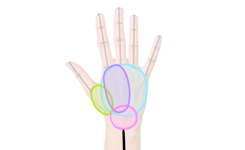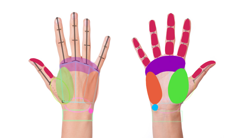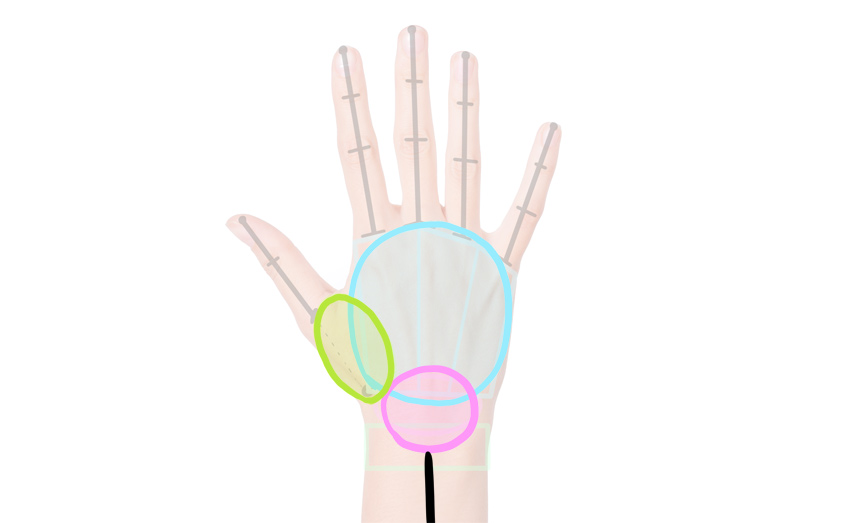 手不仅是骨头-它们还具有肌肉和脂肪。这些元素在手掌侧面最重要。看一下自己的手,找到以下部分: