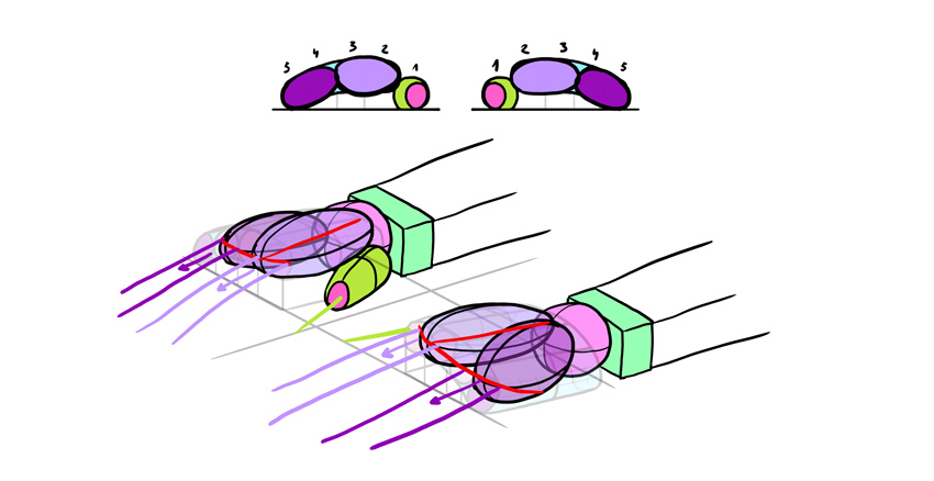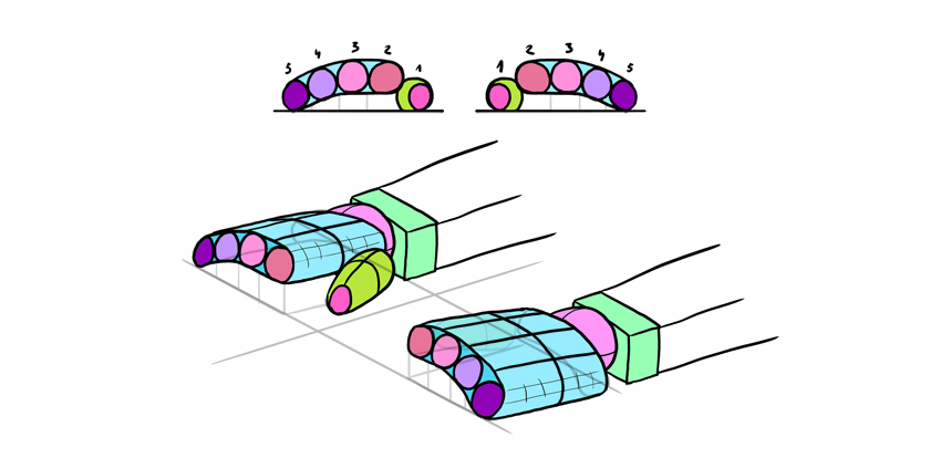 毕竟真实的手是比较复杂的形状,但是有解决此问题的方法。我们可以将手指分为两对,然后将每对连接到单独的椭圆形-就像图钉一样。如果将一对变小(无名指,小指)并将其放低,则会得到我们需要的形状!