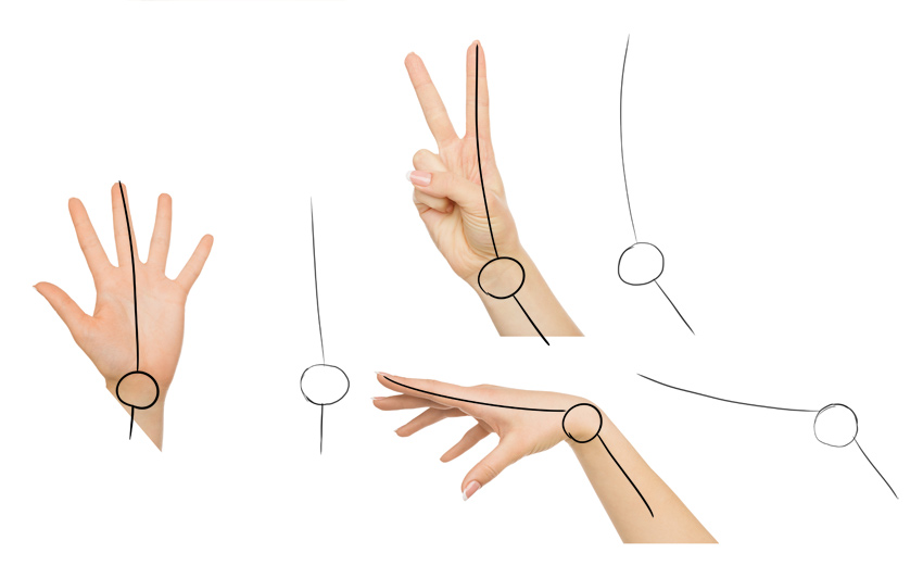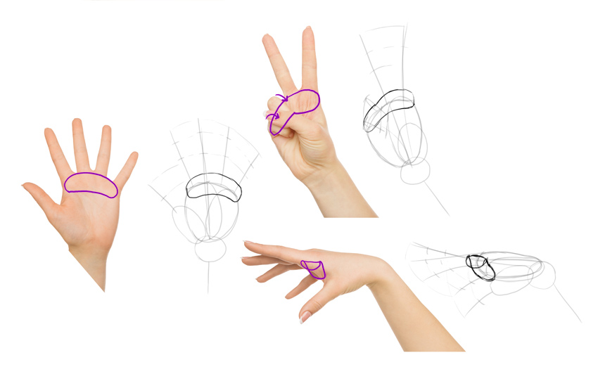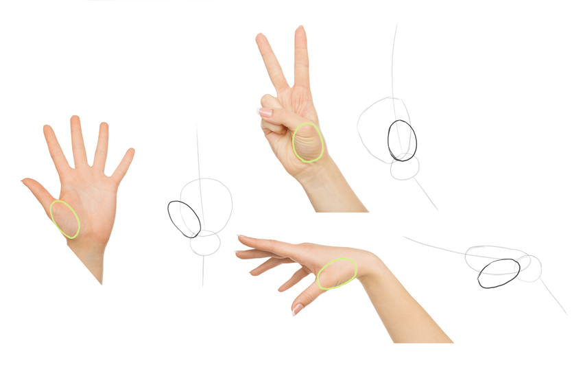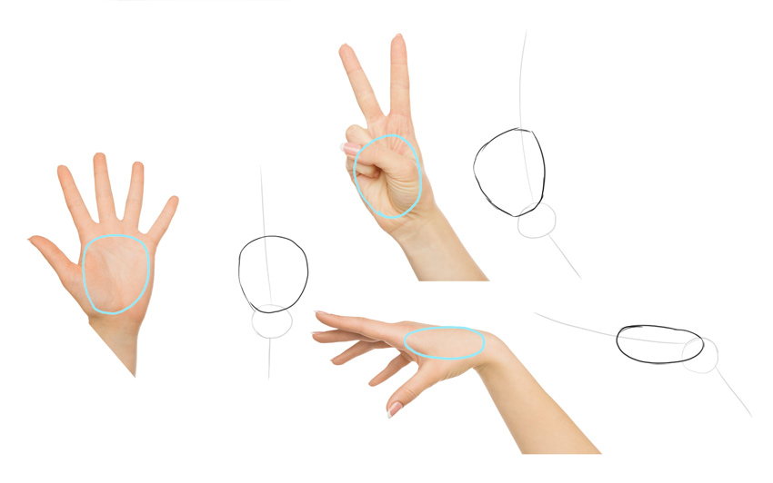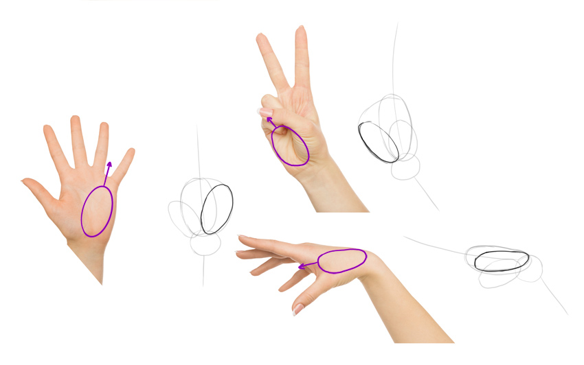 您可以将手腕简化为椭圆形,将手掌简化为较大的椭圆形。以这种方式绘制时,您可以轻松地将手绕着他的手腕旋转,将其想象为一个球。