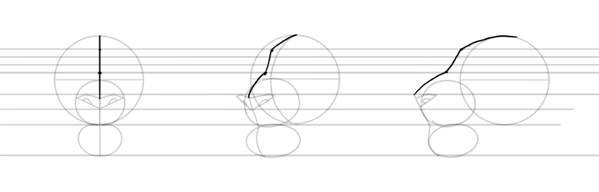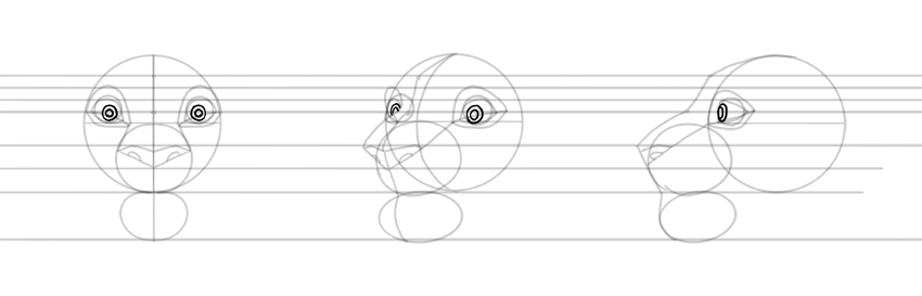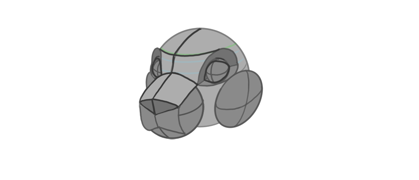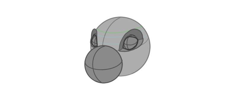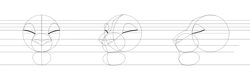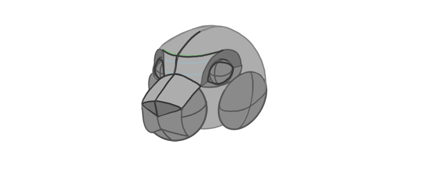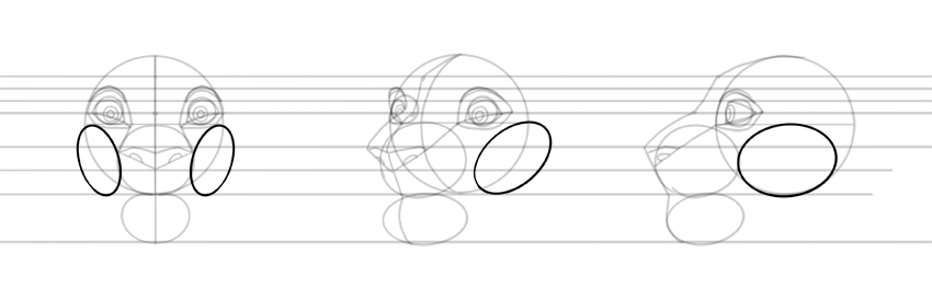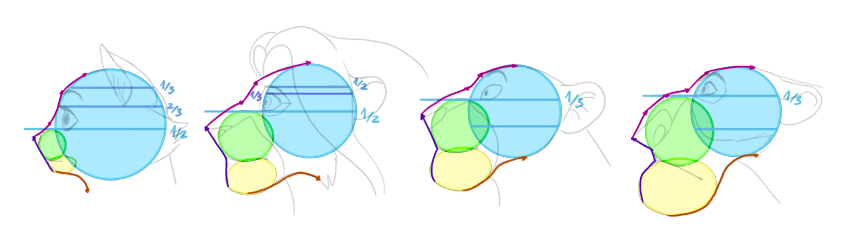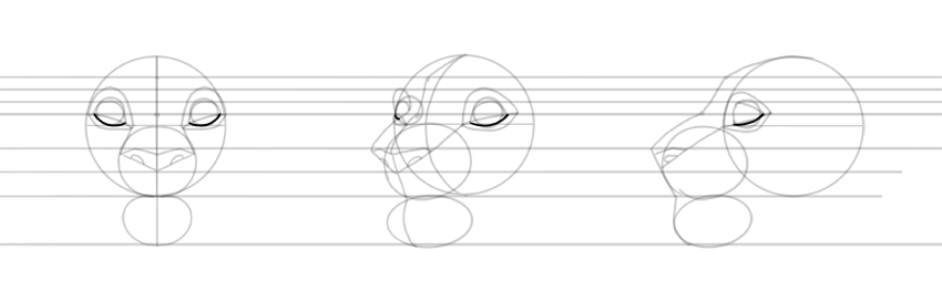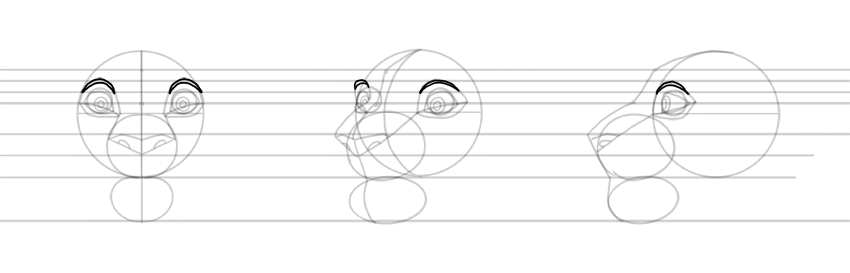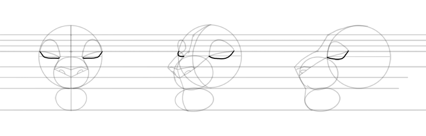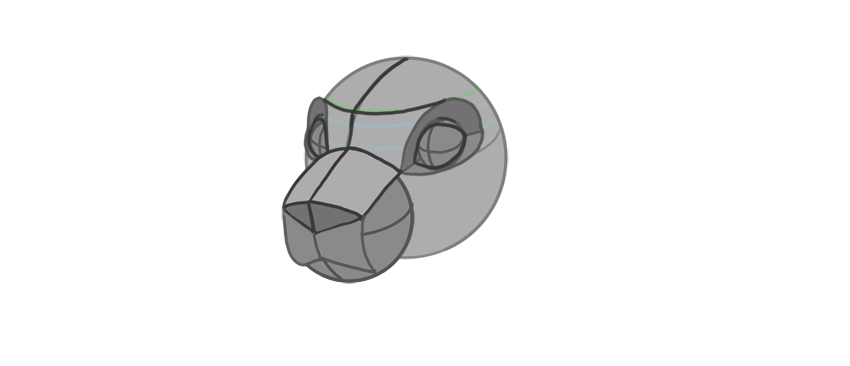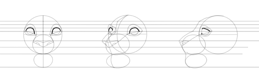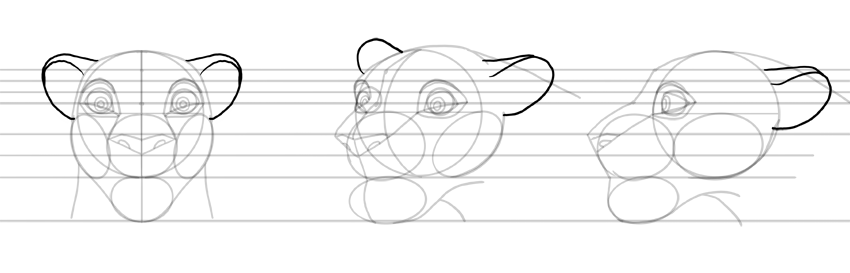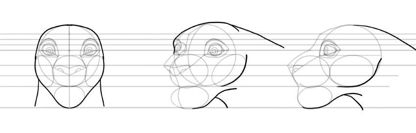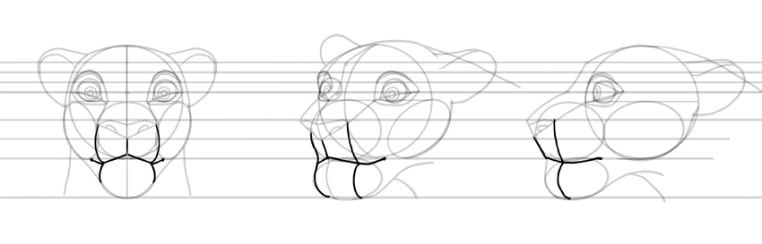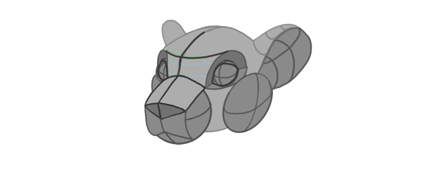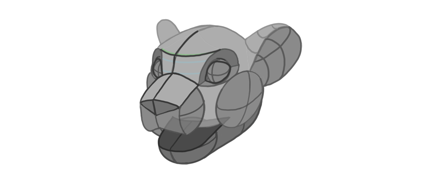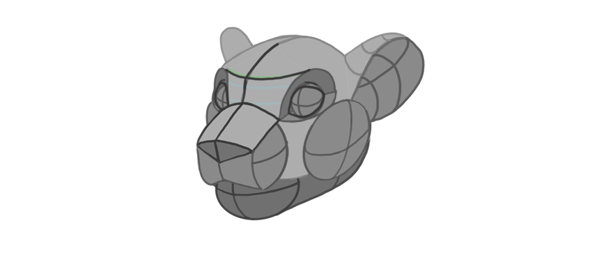 使用此指导线绘制鼻子和额头的形状。对于狮子来说,它离头骨有点远。