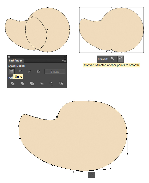 选择底部的锚点,然后使用上方控制面板中的“ 转换选定的锚点以平滑”功能,使形状的底部变为圆形。您可以借助锚点工具(Shift-C)编辑