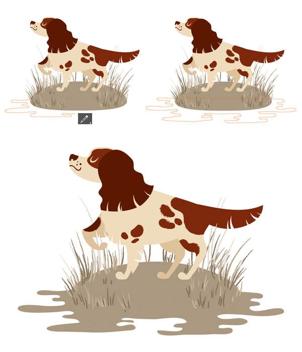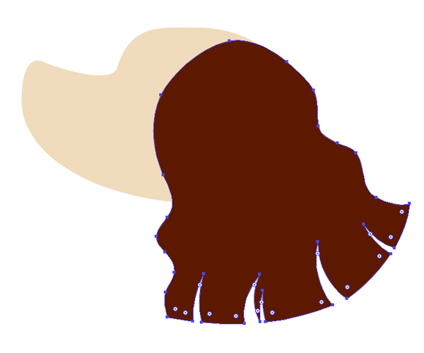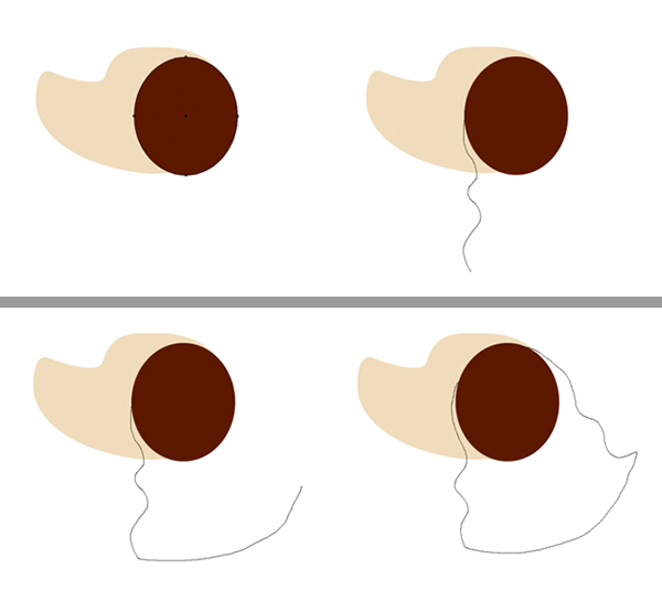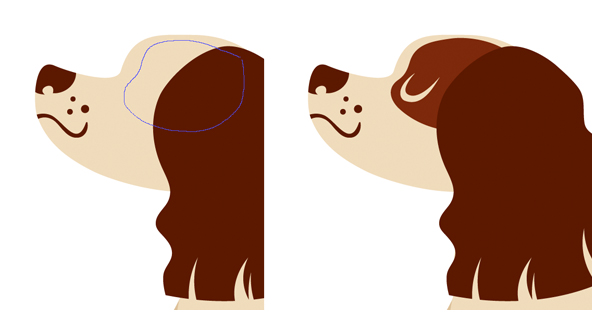 取椭圆工具(L),然后将黑褐色圆圈附加到头部,形成耳根。使用铅笔工具(N)制成波浪形,描绘出卷曲的西班牙猎狗的耳朵。