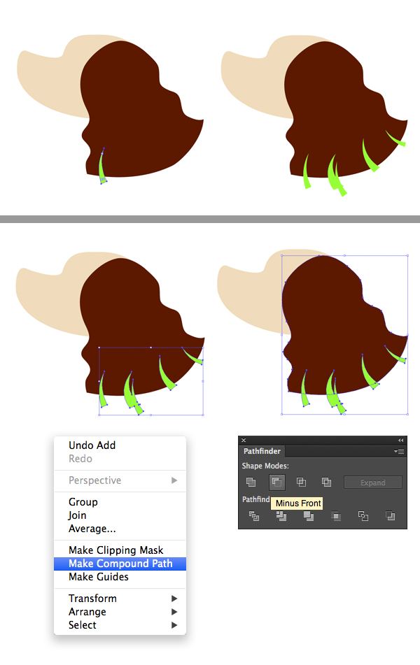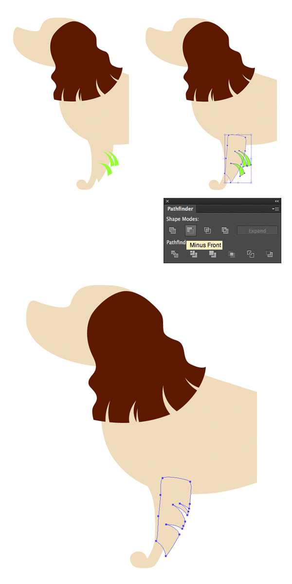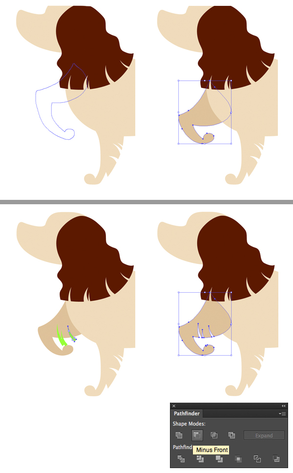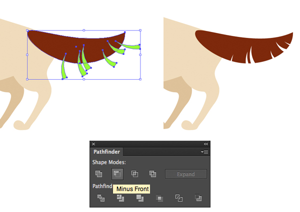 最后,选择耳朵和三角形,然后在“ 路径查找器” 面板中单击“ 减负”以切出凹口。