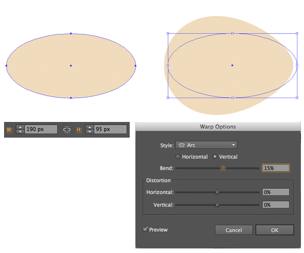 让我们继续前进,形成宠物的身体。首先制作一个190 x 95 px的椭圆,然后转到“ 效果”>“扭曲”>“弧”,将“ 垂直弯曲”值设置为15%,