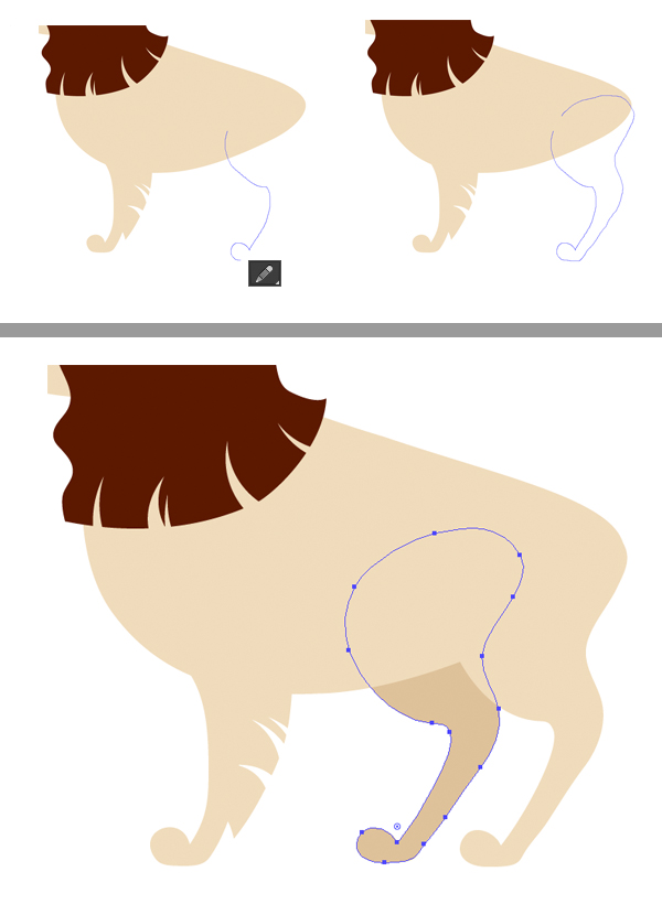 用铅笔工具(N)抽出第二条前腿,使其弯曲并抬起。将腿放在所有其他元素的下方,使其比身体暗一些。在腿的毛茸茸的部位上方放置几个三