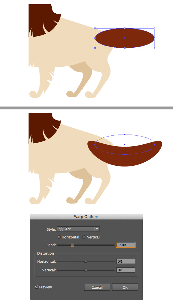 现在,让我们形成一条尾巴,使我们的宠物的身体看起来更完美。使用椭圆工具(L)制作深褐色的椭圆形。转到“ 效果”>“扭曲”>“弧形”