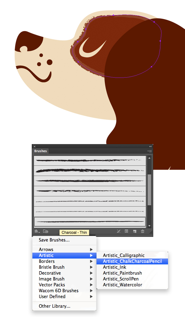 选择我们创建的棕点,然后转到“ 画笔”面板(“窗口”>“画笔”)。打开“ 画笔库”菜单(“ 画笔”面板左下角的小书架图标),然后选