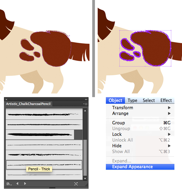 要解决此问题,让我们选择“ 对象”>“扩展形状的外观 ”。现在,我们在“ 图层”面板中将带纹理的轮廓作为单独的对象。选择它,然后使
