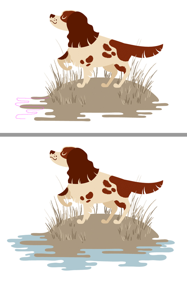 像以前一样,通过移动锚点及其控点来编辑水面曲线。添加少量的地面和水,使插图更加详细。