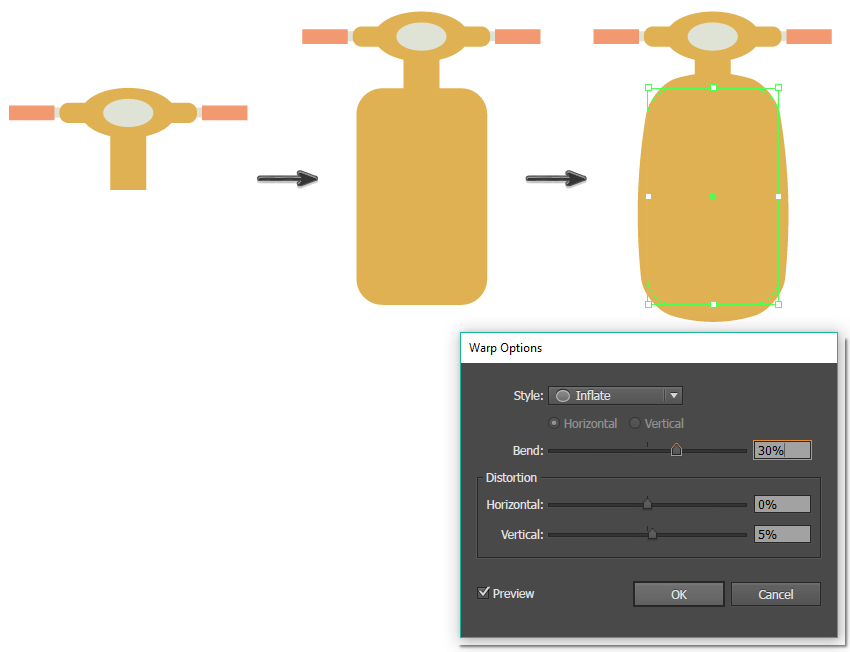 矩形,然后转到“ 效果”>“扭曲”>“膨胀”。输入您在下面看到的选项。这是我们的踏板车的前面。