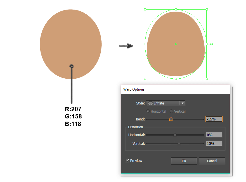 让我们开始绘制男孩的头。使用椭圆工具(L)绘制一个椭圆。在下图中,您可以看到所需的填充颜色。然后转到效果>变形>膨胀。输入您在下