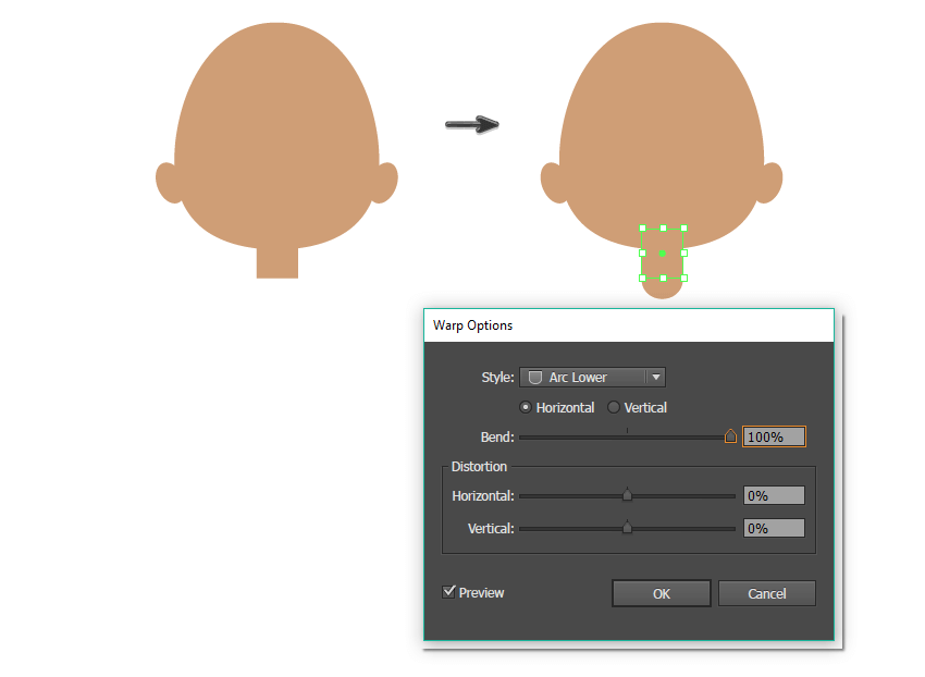 现在,让我们创建脖子。使用矩形工具(M)在头部下方绘制一个小矩形。选中后,转到“ 效果”>“扭曲”>“弧度降低”,然后输入以下选