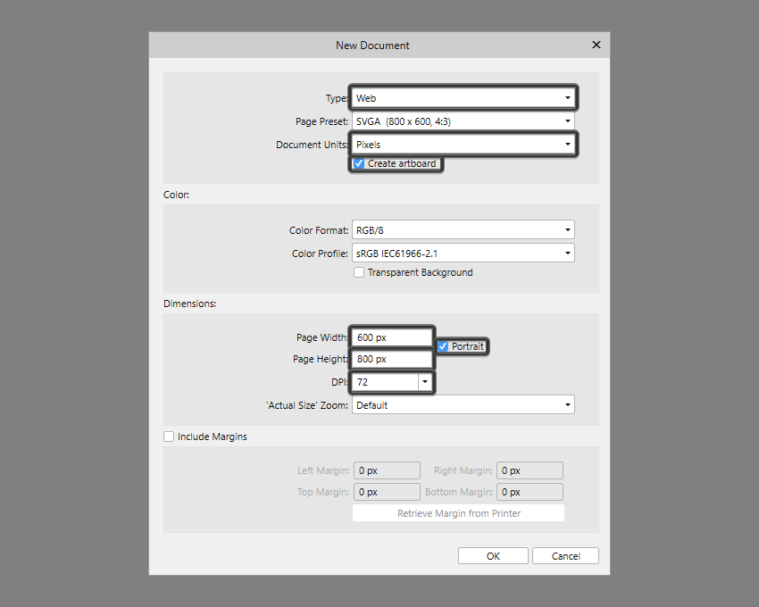 在处理所有项目时,我们将首先通过转到文件>新建(或使用Control-N 键盘快捷键)来设置新文档,然后按以下步骤进行调整: