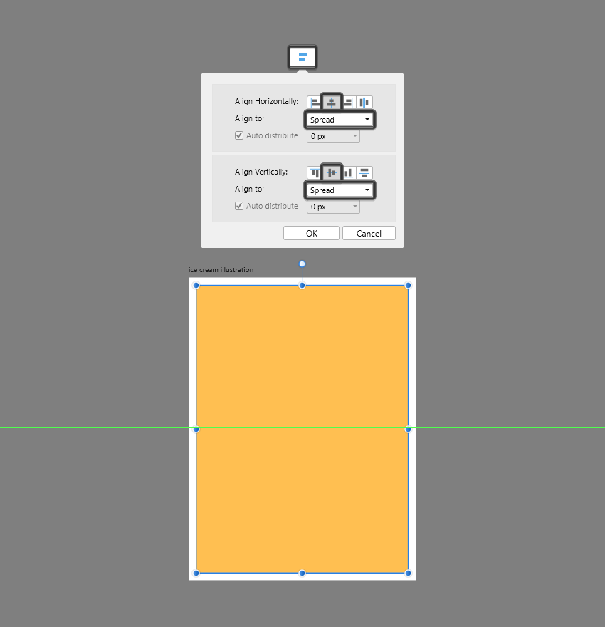 将您自己放置在底层上,然后创建一个560 x 760 px的矩形,我们将使用该矩形进行着色#FFC050 ,然后使用“ 排列”面板的“ 居中对齐”和