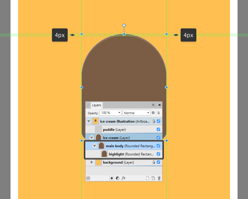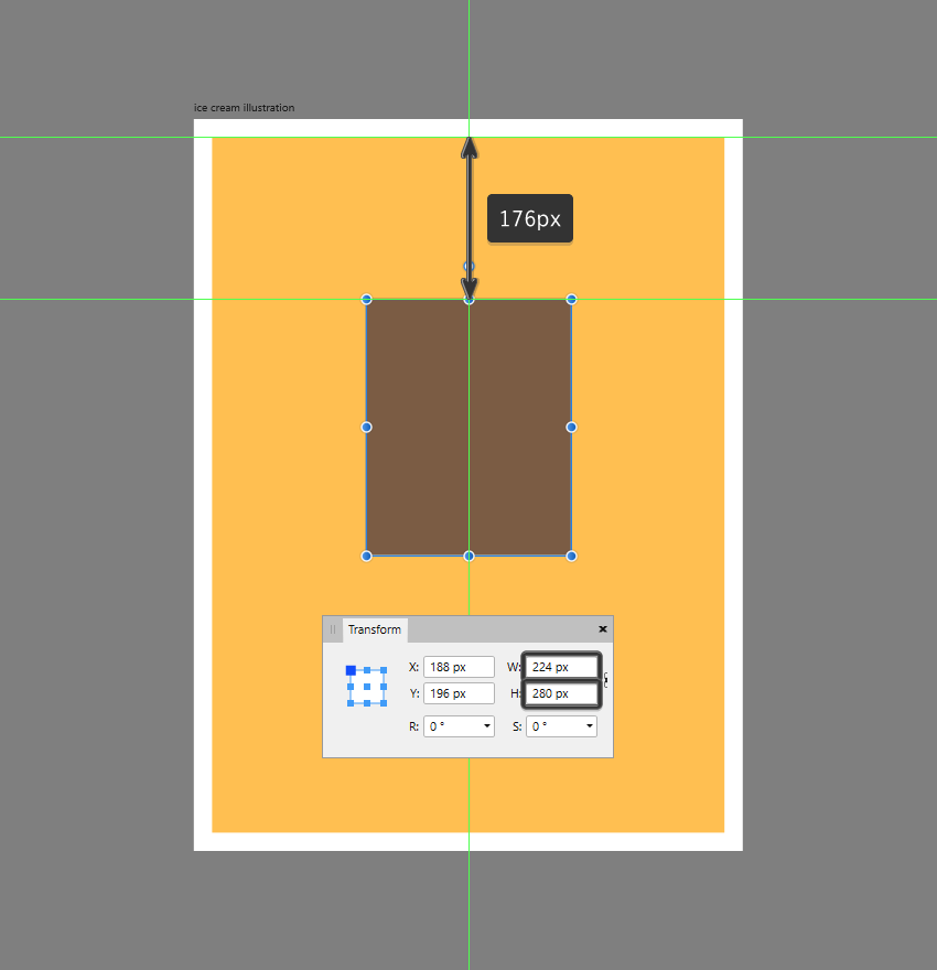 使用224 x 280 px矩形创建冰淇淋的主要形状#7C5B42,然后使用对其进行着色,然后将其居中对齐至下方的艺术版,确保将其与背景的上边缘