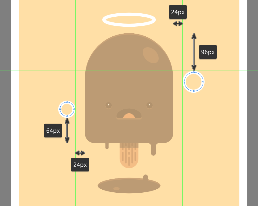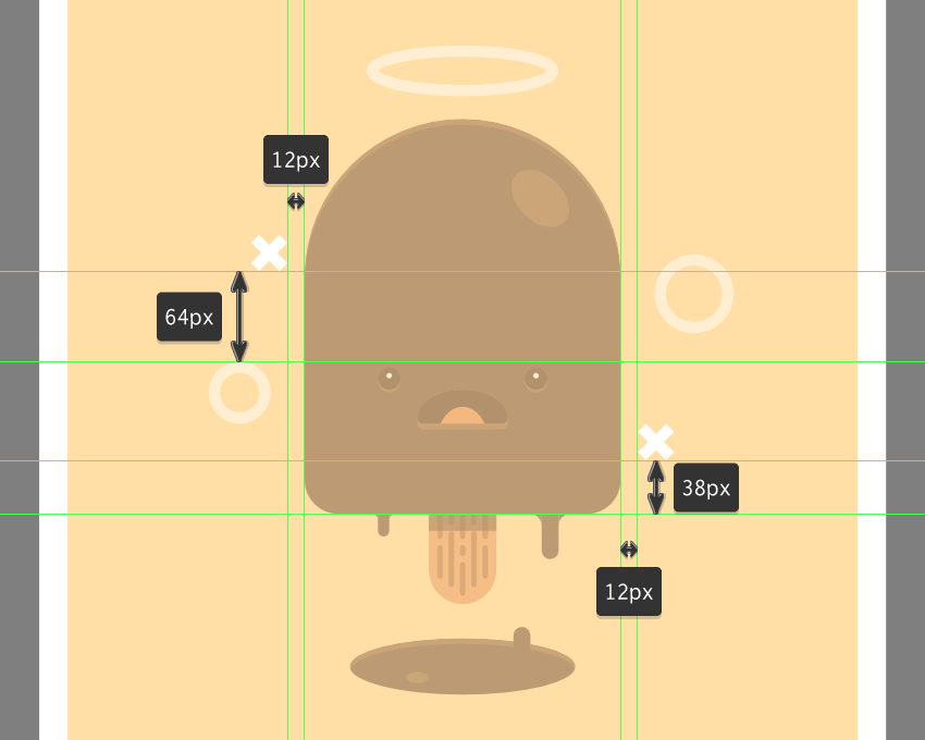 使用36 x 36 px的圆圈和8 pt粗的笔画(#FFFFFF)添加“ o” ,然后添加稍大的48 x 48 px的“ o” ,我们将其放置在冰淇淋的侧面,如参考
