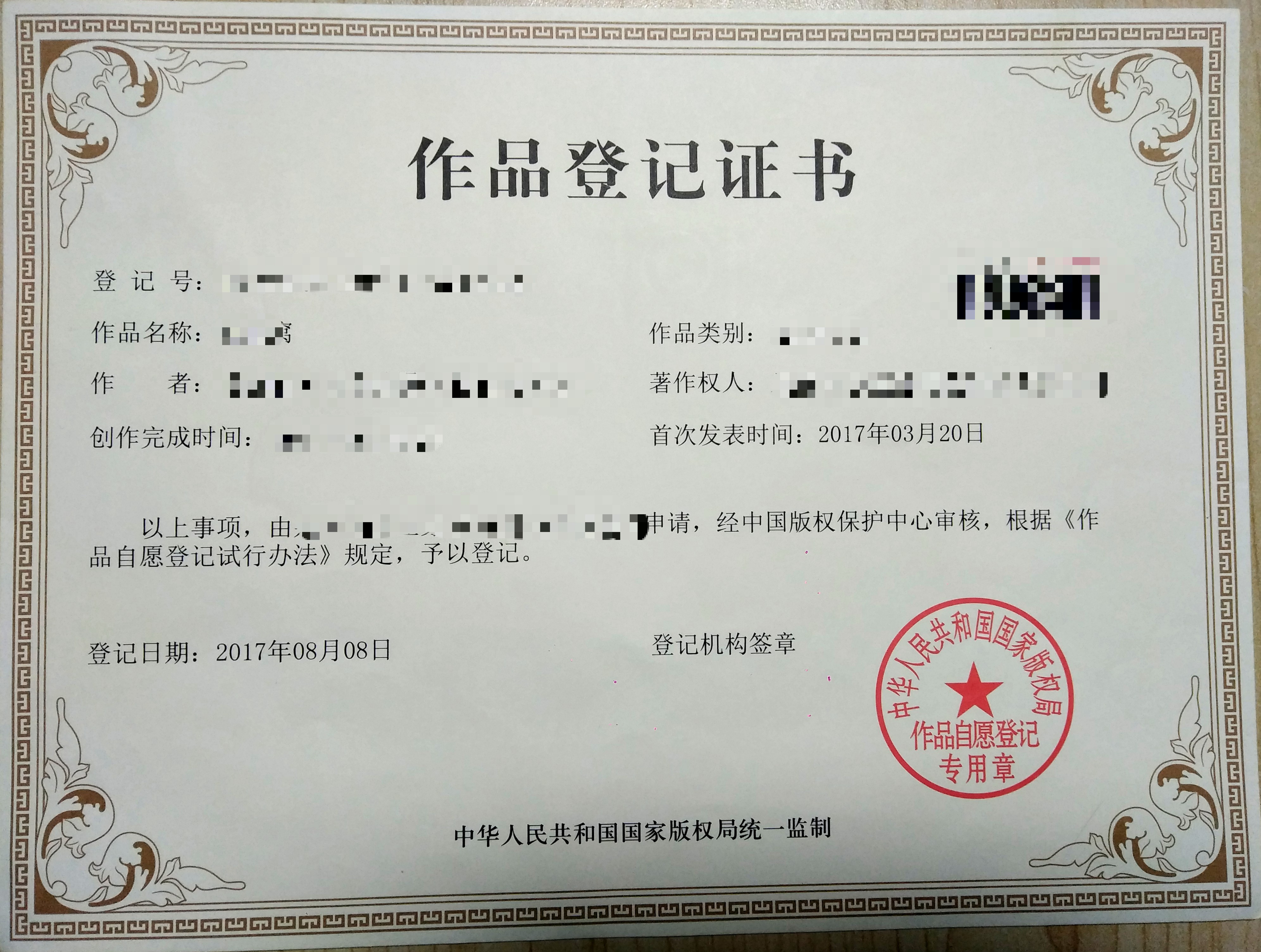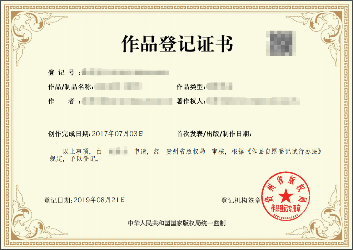 由国家和省版权局下发的作品版权自愿登记证书,在全国乃至《伯尔尼公约》成员国都具有效力。