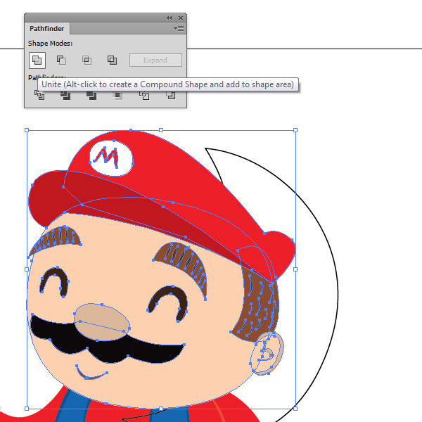 单击一下,选择顶部头部层并打开探路器面板(窗口>探路器)。单击形状模式中的第一个图标Unite。这应该将所有头层内容合并为一个(头、帽子、所有内容)。