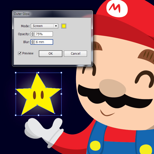 选择星星的黄色底。转到效果>风格化>外发光。将出现一个对话框。将模式设置为 屏幕。选择一种黄色,将“ 不透明度”降低到 75%并将
