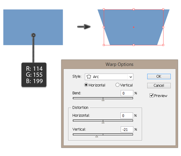 持选中状态的情况下,转到“ 效果”>“扭曲”>“弧”。在新的对话框窗口中,调整选项,如下所示:
