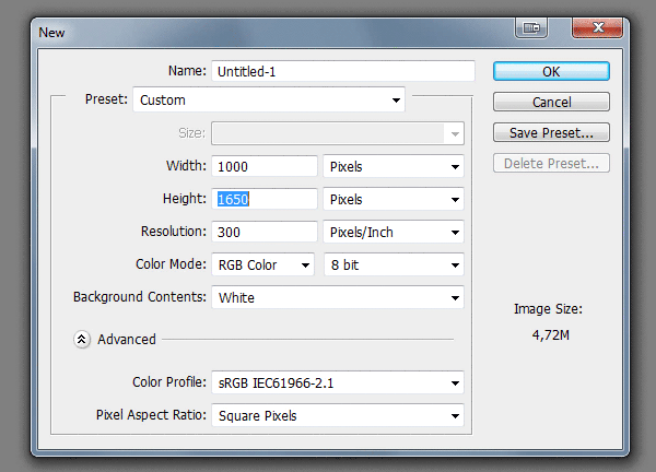 打开Photoshop并转到“ 创建”>“新建”(或使用快捷键Control-N)创建一个新文件。使用1000 x 1650像素的尺寸。尺寸并不那么重要,