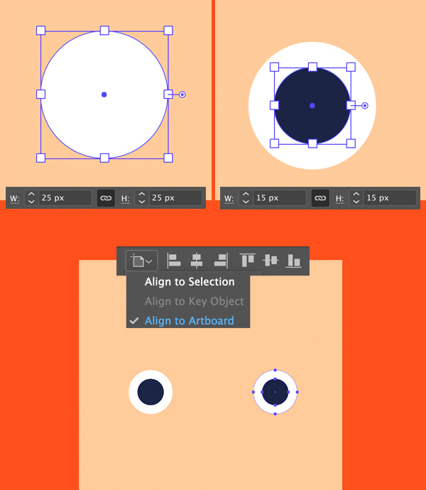 复制(Control-C)创建的圆并粘贴在前面(Control-F)。按住Alt-Shift键并缩小副本(15 x 15 px),将虹膜的“ 填充”颜色更改为深蓝色。