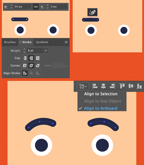 现在,添加眉毛。使用钢笔工具(P)并按住Shift键在眼睛上方绘制30像素的直线。将“ 笔画”颜色设置为深蓝色,并通过在“ 笔画”面板