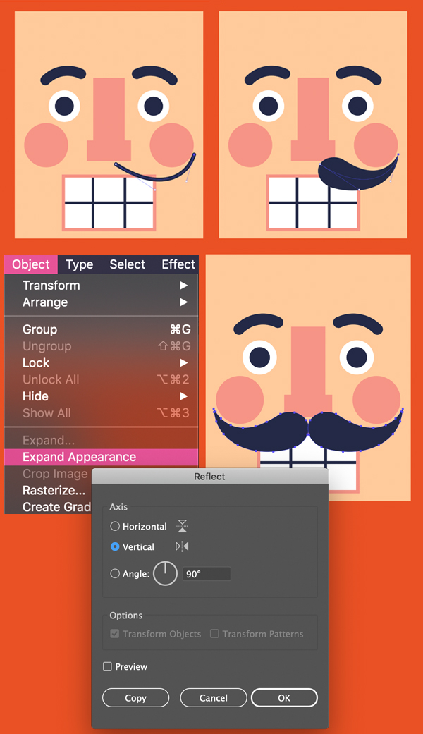 通过按住Alt-Shift并拖动或使用“ 反射工具”(O),将眉头复制到脸部的另一侧。