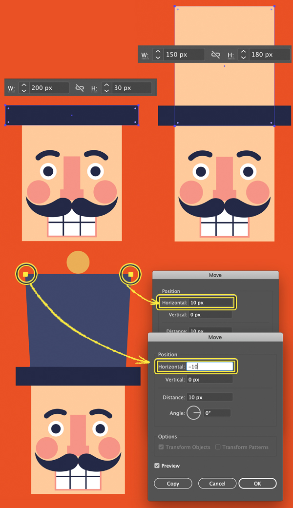 选择左上角与锚点直接选择工具(A) ,然后按Enter键打开移动窗口。将“ 水平”值设置为-10像素,将“ 垂直”值设置为0像素,然后单击