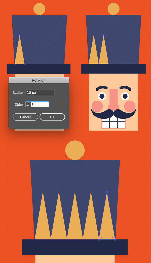 把它放在帽子,按左侧边缘的Alt-Shift键并拖动的三角形右侧,创建一个副本。多次按Control-D重复上一个操作,添加更多三角形。如果最后