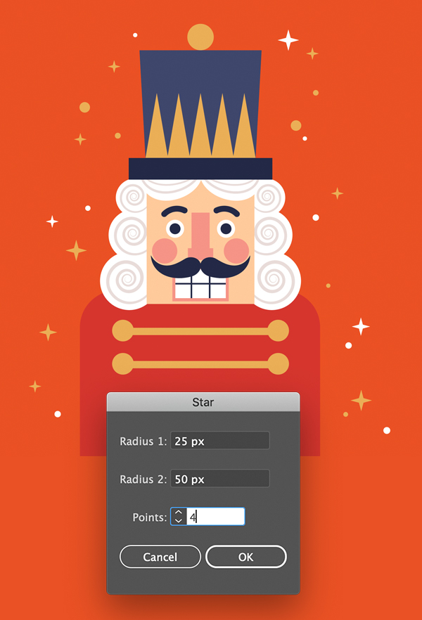 在圣诞节胡桃夹子图标周围散布一些起点和圆圈,为我们的卡片添加一点圣诞节魔术。