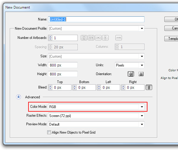 首先,创建一个新文档(文件>新建…)。画板的尺寸并不重要,因为我们将创建一个矢量元素,将来可以在不同的艺术品中使用。单击高级按