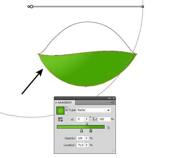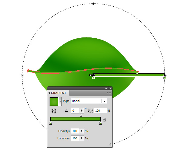 (R = 72,G = 163 B = 4)的径向梯度填充叶子的下半部分。现在使用渐变工具(G),通过单击并拖动中心来移动径向渐变的中心。我们需