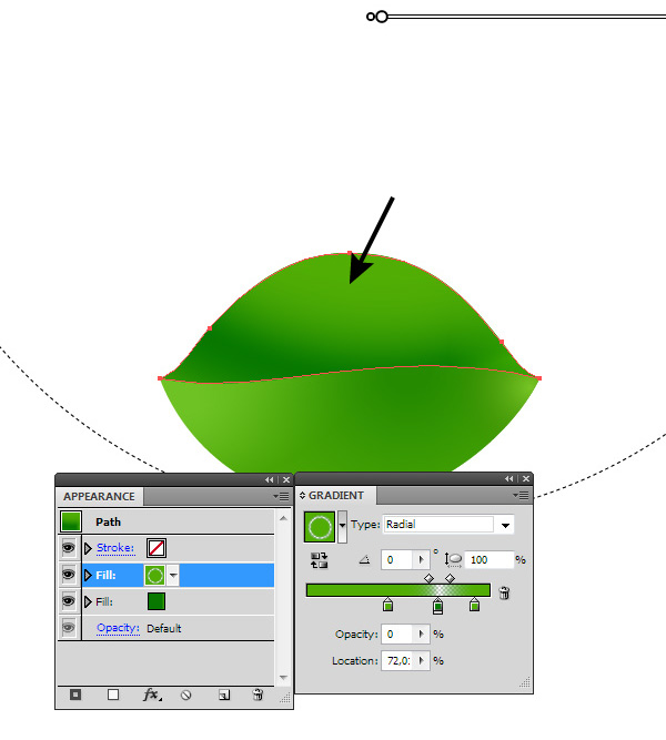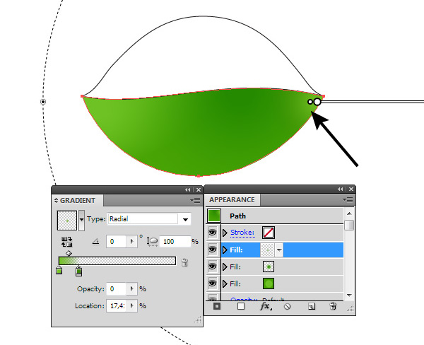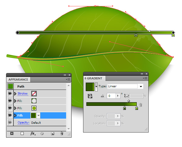 (R = 61,G = 130,B = 3)。右侧滑块的透明度为0%。应放置渐变的中心以减轻叶子的右角。 如您所见,通过使用“外观”面板和带有透明