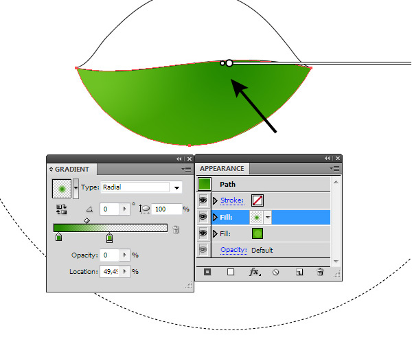 最后,我们在外观面板中再创建一个填充。新的径向渐变由两种颜色组成。这些是绿色(R = 9,G = 130,B = 0),左侧滑块的透明度为0%