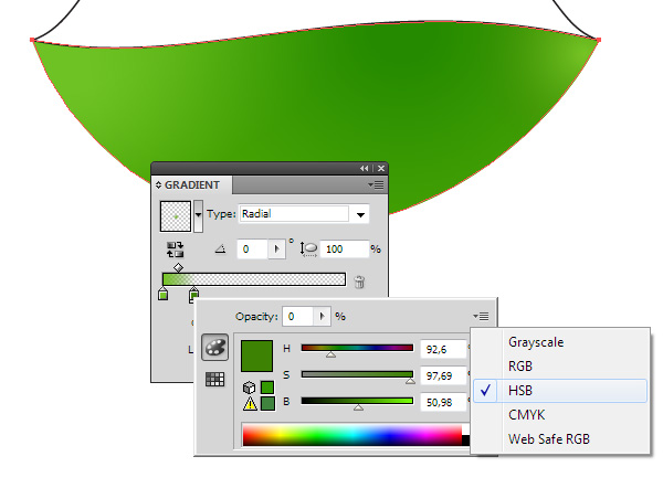 在“外观”面板中创建一个新的填充。此填充的径向渐变具有以下颜色:左侧滑块为绿色(R = 118,G = 196,B = 37),右侧滑块为绿色
