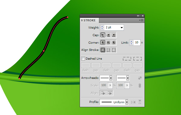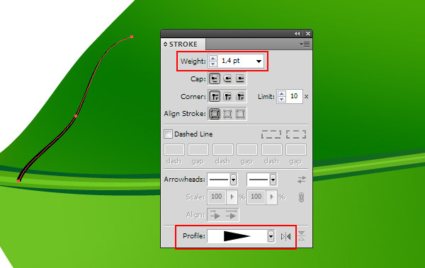 让我们在叶子上创建静脉。拿铅笔工具(N)或钢笔工具(P),用黑色填充线创建一条波浪线。 在“描边”面板中将三角形轮廓应用于此路径。