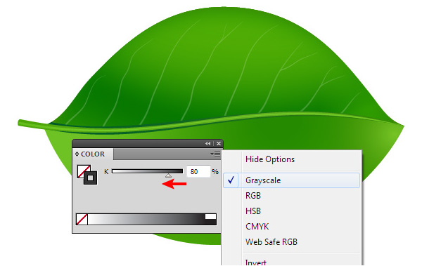 在“颜色”面板中打开“ 灰度”颜色模式,然后减小K值以获得所需的静脉颜色强度。 隐藏路径的边缘(“视图”>“隐藏边缘”或使用