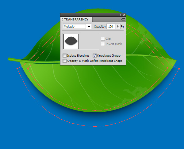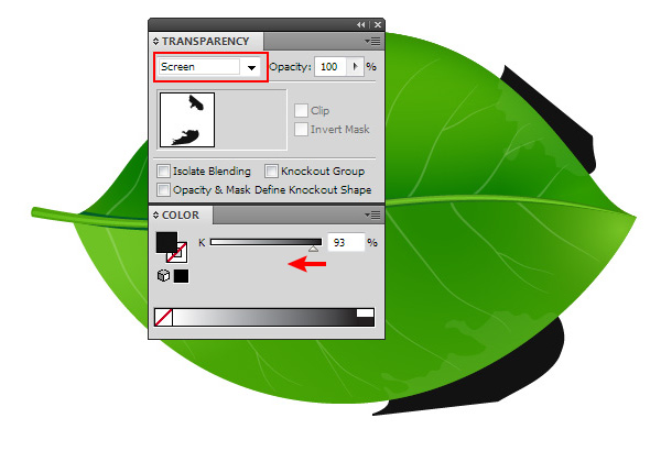 在绿叶矢量的上部创建其余的静脉,然后将它们分组(Command / Ctrl + G)。 将组放在茎下面。现在,将“ 透明度”面板中的“ 屏幕混合”