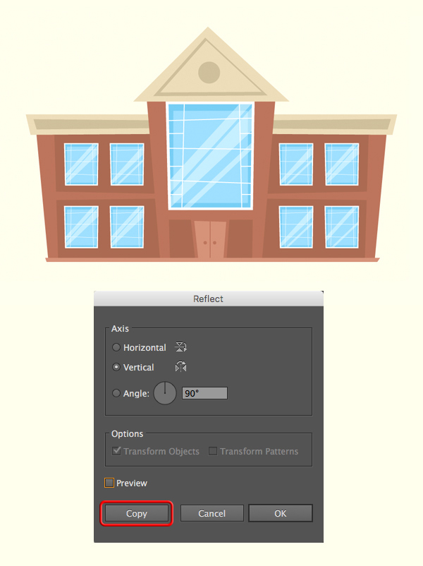 现在,我们可以对建筑物左翼的所有元素进行分组(Control-G),并使用“ 反射工具”(O)创建镜像副本,将右翼连接到建筑物的另一侧。