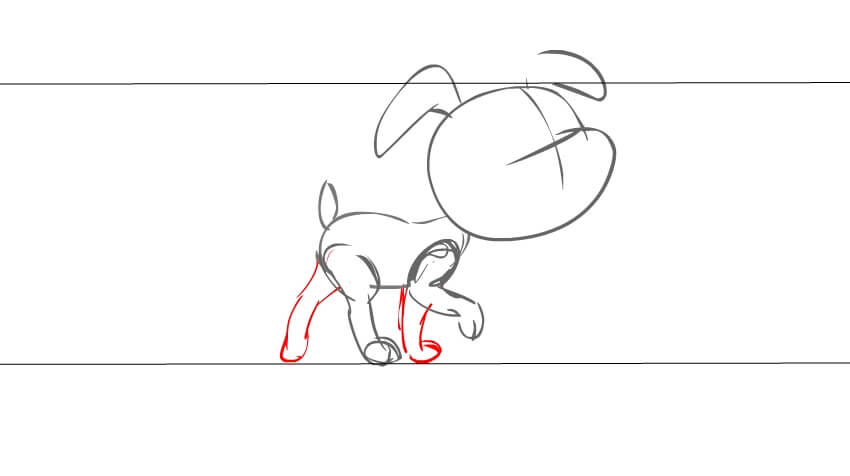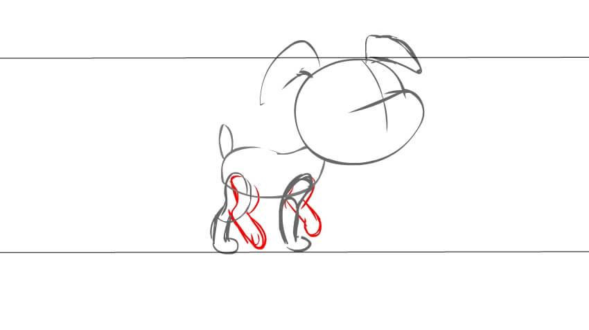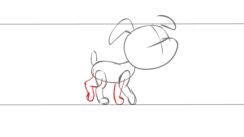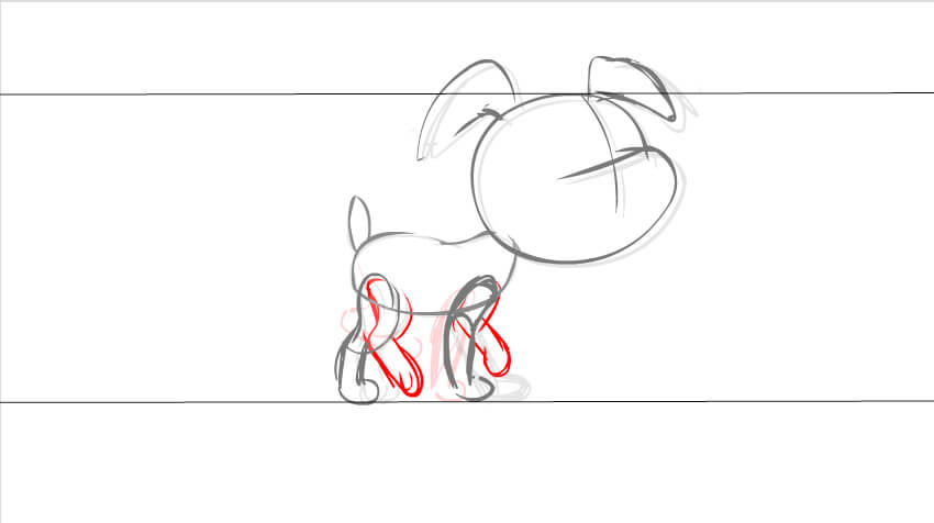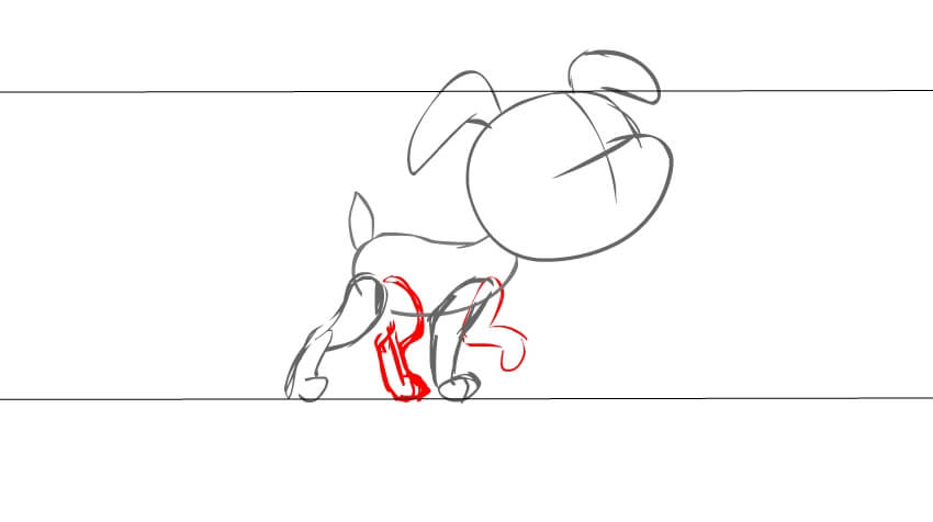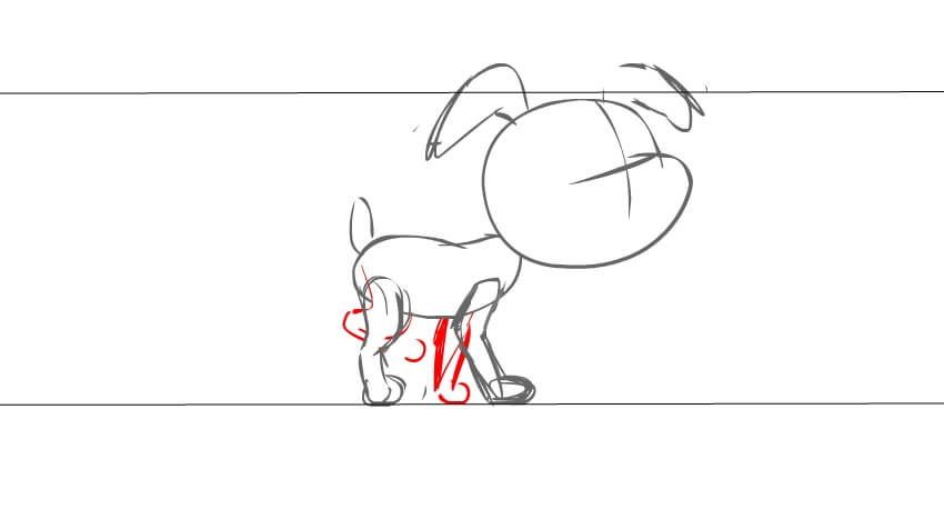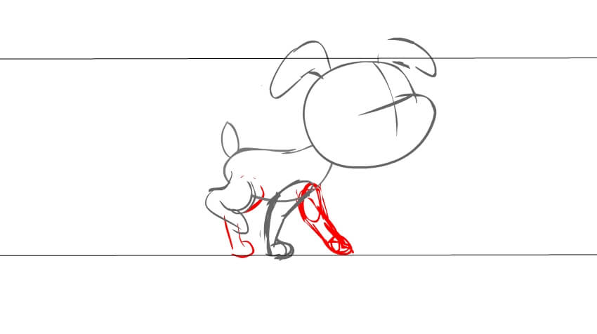 参考图1,让我们从简单的狗草稿开始,后面再去添加更多细节。用红色标注离我们视线比较远的腿,左后腿和左前腿。左后腿抬起正好经过右后腿中间区域。